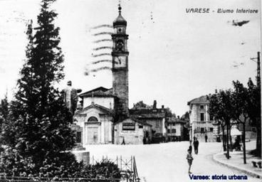 Keywords: Vista di largo IV Novembre. La sagrestia che sorgeva addossata alla chiesa dei Santi Pietro e Paolo non è più esistente. A destra il Monumento ai Caduti (Daniele Scola, 1923). varese biumoinferiore