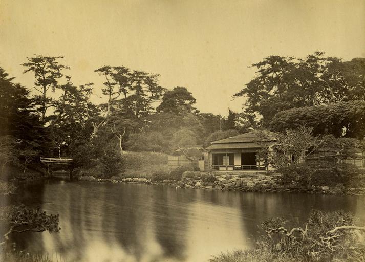 Keywords: Bjh42 Yedo TycoonGarden.jpg THE TYCOON ™S SUMMER GARDENS AT YEDO MR LEIGHTON remarks with reference to the Japanese ” They seem fond of sensations the sweet the soft and pretty is heightened by the grotesque yet all in harmony In all their gardens and grounds there is a great similarity of ornament; miniature lakes of more or less capacity will trimmed lawns of smooth green turf ”varieties of quaintly trimmed shrubs and trees tortured into queer shapes imitating junks under full sail candelabra tortoises cranes and other objects abound The graceful bamboo the more stately forest trees shrubs with variegated leaves alternate with clusters of azaleas and bright flowers in profusion Pretty little tea-houses ”bridges spanning artificial ponds where gold-fish are kept ”platforms also projecting into these little lakes where anglers may amuse themselves; and trellis-work arbours with vines and creepers trained over them are not wanting in this quiet retreat of the Tycoon There is one part of these gardens set aside for hawking ”a sport which is reserved for the higher and privileged classes in most parts of Japan and is limited to the Tycoon alone within his domain ”so much so that no private individual may even keep a falcon http //ocw mit edu/ans7870/21f/21f 027j/beato_places/fb_menu html between 1863 and early 1870s Creator Felice Beato PD-old-100 Edo Hama Villa Ponds in Tokyo Photographs of Japan by Felice Beato |