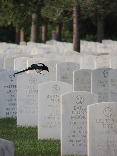 Keywords: black-billed magpie magpie cemetery black-billed black white perched headstones national cemetery fort logan