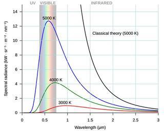 | Keywords: Black body.svg en Black body curves of Planck for various temperatures and comparison with classical theory of Rayleigh-Jeans it Confronto fra le curve del corpo nero della teoria di Planck e della teoria classica di Rayleigh-Jeans own Darth Kule 2010-06-05 <gallery> File Black body mk svg language mk </gallery> translatable Created with Gnuplot gnuplot source <source lang gnuplot > set term svg set termoption enhanced set encoding utf8 set output 'Black_body svg' unset key set tics nomirror out set border 3 set xrange 0 6 set yrange 0 15 set ylabel Spectral radiance kW sr ¹ m ² nm ¹ set xlabel Wavelength μm set label 5000 K at 0 45 13 1 set label 4000 K at 0 6 4 55 set label 3000 K at 0 8 1 4 set label Classical theory 5000 K at 1 55 11 set grid lc rgb light-blue length unit is micrometre c 3e14 speed of light h 6 626e-22 Planck constant k 1 38e-11 Boltzmann constant Planck curves p1 x 1e-6 2 h c 2/ x 5 exp h c/ x k 3000 -1 p2 x 1e-6 2 h c 2/ x 5 exp h c/ x k 4000 -1 p3 x 1e-6 2 h c 2/ x 5 exp h c/ x k 5000 -1 p4 x 1e-6 2 h c 2/ x 5 exp h c/ x k 6000 -1 Rayleigh-Jeans curve rj x 1e-6 2 c k 5000/ x 4 plot p1 x lw 2 p2 x lw 2 p3 x lw 2 p4 x lw 2 plot rj x lw 2 lc rgb black </source> Rayleigh Jeans law Images with Gnuplot source code |