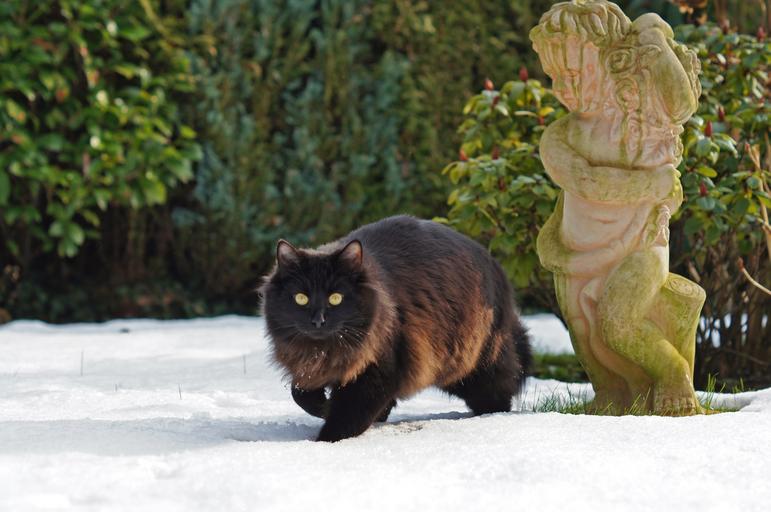 Keywords: black cat snow winter feline outdoors fur hunting domestic kitty pet furry looking yard