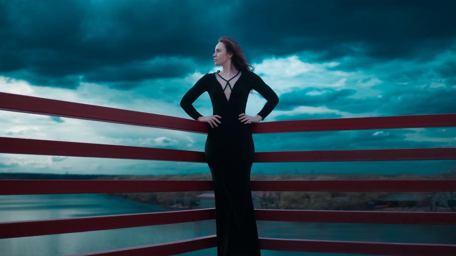 Keywords: black dress girl triple emotions fashion style woman model beauty hair hairstyle female photoshoot person posture long black dress female hands thinking lady bw dreaminess on the bridge view queen dress long hair sitting women