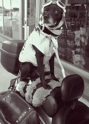 Keywords: black white dog motorcycle animal pets happy cute recreation companion goggles saddlebag