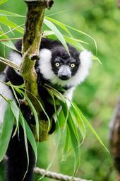 Keywords: black and white ruffed lemur wildlife madagascar nature portrait perched looking exotic rainforest primate mammal fur tree leaves