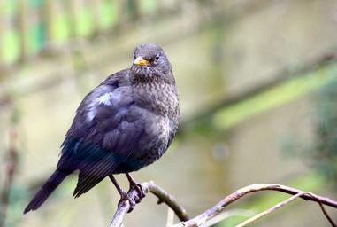 Keywords: blackbird beak feathers black wings eye twig branch animal nature wildlife ornithology plumage birdwatching outdoors looking close bill closeup