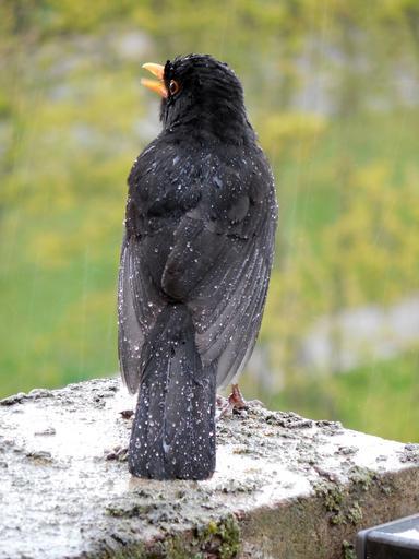 Keywords: blackbird bird songbird rain plumage feather raindrop wet spring dress black