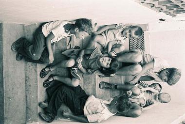 Keywords: Hanging out on the back stairs. From the top left: Alan Russell, Paul, David, John, Sue, Melvin Noah, Jerry Noah.