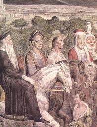 | Keywords: Blake-Cant-pilgrims-detail-a1.jpg en Blake-Cant-pilgrims-detail-a1 Coloured engraving 2nd state 1810 Chaucer's Canterbury Pilgrims Copper engraving with additions in watercolor by the artist Signature and imprint Painted in Fresco by William Blake by him Engraved Published October 8 1810 at No 28 Corner of Broad Street Golden Square; inscribed below Chaucers Canterbury Pilgrims and with the names of the pilgrims Reeve Chaucer Clerk of Oxenford Cook Miller Wife of Bath Merchant Parson Man of Law Plowman Physician Franklin 2 Citizens Shipman The Host Sompnour Manciple Pardoner Monk Friar a Citizen Lady Abbess Nun 3 Priests Squires Yeoman Knight Squire The engraving is known in five states Blake's use of line engraving emulating the styles of early printmakers Albrecht Dürer and Lucas van Leyden evokes the character of Chaucer's poetry Blake painted the pilgrims after a quarrel with R H Cromek and Thomas Stothard regarding whether the commission had originally been Blake's The painting was exhibited at his brother's Soho shop in 1809 and this engraving was created from it 2013-05-17 19 03 22 scanned from a book Creator William Blake PD-old-100 Uploaded with UploadWizard William Blake's Chaucer |