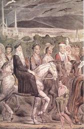| Keywords: Blake-Cant-pilgrims-detail-a.jpg en Blake-Cant-pilgrims-detail-a Coloured engraving 2nd state 1810 Chaucer's Canterbury Pilgrims Copper engraving with additions in watercolor by the artist Signature and imprint Painted in Fresco by William Blake by him Engraved Published October 8 1810 at No 28 Corner of Broad Street Golden Square; inscribed below Chaucers Canterbury Pilgrims and with the names of the pilgrims Reeve Chaucer Clerk of Oxenford Cook Miller Wife of Bath Merchant Parson Man of Law Plowman Physician Franklin 2 Citizens Shipman The Host Sompnour Manciple Pardoner Monk Friar a Citizen Lady Abbess Nun 3 Priests Squires Yeoman Knight Squire The engraving is known in five states Blake's use of line engraving emulating the styles of early printmakers Albrecht Dürer and Lucas van Leyden evokes the character of Chaucer's poetry Blake painted the pilgrims after a quarrel with R H Cromek and Thomas Stothard regarding whether the commission had originally been Blake's The painting was exhibited at his brother's Soho shop in 1809 and this engraving was created from it 2013-05-17 19 03 20 scanned from a book Creator William Blake PD-old-100 Uploaded with UploadWizard William Blake's Chaucer |