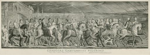 | Keywords: Blake Canterbury Pilgrims engraving.jpg The Canterbury Pilgrims Copper engraving printed on paper Approximately 1 × 3 ft Multiple impressions in various collections; this impression is owned by The McCormick Library of Special Collections at Northwestern University Illinois USA The Canterbury Pilgrims Trad « Les pélerins de canterbury » Gravure sur cuivre de 33 × 100 cm environ Il existe de nombreux exemplaires de cette gravure ici celui de la bibliothèque McCormick de la Northwestern University dans l'Illinois États-Unis Chaucer's Canterbury Pilgrims Copper engraving with additions in watercolor by the artist Signature and imprint Painted in Fresco by William Blake by him Engraved Published October 8 1810 at No 28 Corner of Broad Street Golden Square; inscribed below Chaucers Canterbury Pilgrims and with the names of the pilgrims Reeve Chaucer Clerk of Oxenford Cook Miller Wife of Bath Merchant Parson Man of Law Plowman Physician Franklin 2 Citizens Shipman The Host Sompnour Manciple Pardoner Monk Friar a Citizen Lady Abbess Nun 3 Priests Squires Yeoman Knight Squire This is a magnificent example of Blake's largest print The engraving is known in five states Blake's use of line engraving emulating the styles of early printmakers Albrecht Dürer and Lucas van Leyden evokes the character of Chaucer's poetry Blake painted the pilgrims after a quarrel with R H Cromek and Thomas Stothard regarding whether the commission had originally been Blake's The painting was exhibited at his brother's Soho shop in 1809 and this engraving was created from it http //www library northwestern edu/librarybriefings/archives/001548 html Page url http //www library northwestern edu/spec/blake/wm_blake_big jpg Image url 1st state 1810 This impression is from the 5th state printed c 1820-23 Creator William Blake Public domain artwork The Wife of Bath Blake jpg thumb left 3rd state printed c 1810-20 with flesh tones added in watercolor Assessments c 2009 1 1 PD-old-100 William Blake's engravings 19th-century engravings Canterbury Tales People with horses in art Pilgrimages in art William Blake's Chaucer |