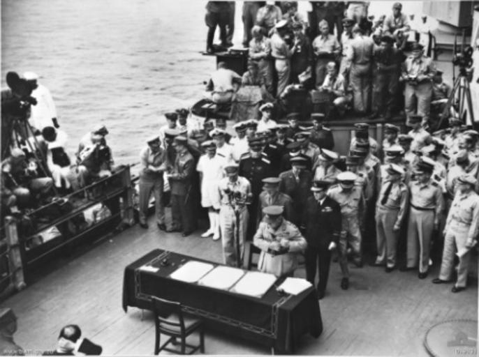 Keywords: BLAMEY surrender 1945.jpg en AWM caption Tokyo Bay Japan 2 September 1945 General Sir Thomas Blamey at the table about to sign the surrender document on behalf of Australia Behind General Blamey are the other members of the Australian delegation The signing took place on board Admiral Nimitz's flagship USS Missouri Allied delegations are lined up behind their delegation leader waiting their turn to sign the surrender document Left to right Admiral Chester W Nimitz US; General Hsu Yung-Chang Nationalist Chinese; Admiral Sir Bruce Fraser UK; Lt Gen K N Derevyanko Soviet Union; Colonel L Moore-Cosgrove Canada; Gen B J Le Clerc France; Admiral Conrad Helfrich Netherlands; Air Vice Marshal Isitt New Zealand In the foreground is the Japanese General Yoshijiro Umezo and Mr Mamoru Shigemitsu hand to head the signatories for Japan 019131 unknown photographer -- now belonging to Commonwealth of Australia 1945-09-02 The AWM record for this photo states that the copyright status is 'clear' The photo was taken prior to 1955 PD-Australia The AWM allows the use of images from its online database whose copyright has expired for non-commercial purposes only on the condition that the AWM's watermark is not removed The Australian War Memorial AVM however requires that the AWM watermark is not removed and that permission be sought for commercial use Higher resolution versions of this image may be ordered through the AWM Website at http //www awm gov au Surrender of Japan 2 September 1945 Thomas Blamey Military history of Australia during World War II Japanese Surrender Black and white photographs