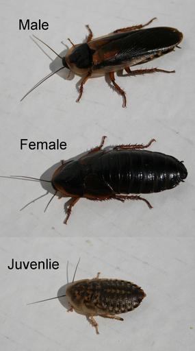 Keywords: Blaptica-Dubia-cockroaches-x3-male-female-juvenile.jpg en A mosaic of 3 images showing an adult male adult female and juvenile Blaptica Dubia cockroaches own Nicky Animals 2008 thumb Blaptica dubia