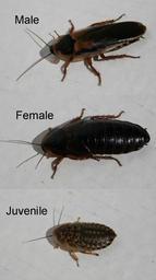 Keywords: Blaptica-Dubia-cockroaches-x3-male-female-juvenile-v2.jpg en A mosaic of 3 images showing an adult male adult female and juvenile Blaptica Dubia cockroaches own Nicky Animals 2008 thumb Blaptica dubia