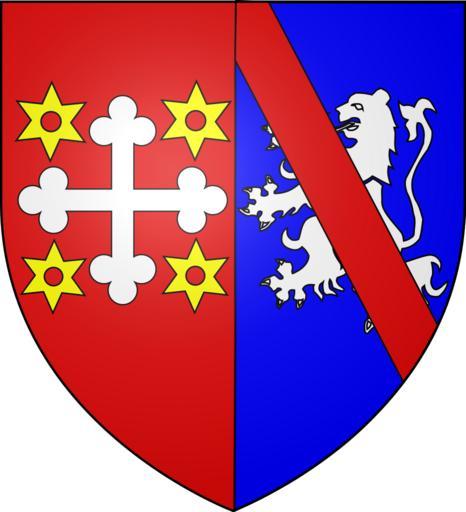 Keywords: Blason de la famille Gillet de Chalonge.svg parti au premier de gueules à la croix alésée tréflée d'argent cantonnée de quatre molettes d'éperon d'or au second d'azur au lion d'argent et à la bande cousue de gueules brochant sur le tout moi et inkscape Nicolas C 2009-06-01 SVG coats of arms of families of France |