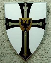 | Keywords: teutonic teutonique ritter hochmeister knight order croisade crusade ordre chevalerie blason ordo fratrum domus sanctae mariae teutonicorum ierosolimitanorum Il raconte l'histoire de l'Ordre: - la croix de sable (noire) sur champ d'argent (blanc) est l'inverse de celui des Hospitalier de Saint-Jean auquel il fut un moment attaché. - la croix d'or de Jérusalem rappelle le rôle de l'Ordre dans la défense du Royaume - les Lys d'or à ses extrémité sont une distinction octroyé par le Roy de France Louis IX (dit Saint Louis) le 20 Août 1250 lorsqu'il combattu aux côtés de l'Ordre durant la 7e Croisade - l'aigle mis en abîme (au centre) est le blason du Saint-Empire dont il se fit membre pour conquérir la Prusse "The coat of arms representing the grand master (Deutschmeisterwappen) is shown with a golden cross fleury or cross potent superimposed on the black cross, with the imperial eagle as a central inescutcheon. The golden cross fleury overlaid on the black cross becomes widely used in the 15th century. A legendary account attributes its introduction to Louis IX of France, who on 20 August 1250 granted the master of the order this cross as a variation of the Jerusalem cross, with the fleur-de-lis symbol attached to each arm. While this legendary account cannot be traced back further than the early modern period (Christoph Hartknoch, 1684) there is some evidence that the design does indeed date to the mid 13th century." Source: en.wikipedia.org/wiki/Grand_Masters_of_the_Teutonic_Order... It still exists today as religious/humanitarian association www.deutscher-orden.de/ and historical reenactment associations like www.imperialteutonicorder.com/ Il raconte l'histoire de l'Ordre: - la croix de sable (noire) sur champ d'argent (blanc) est l'inverse de celui des Hospitalier de Saint-Jean auquel il fut un moment attaché. - la croix d'or de Jérusalem rappelle le rôle de l'Ordre dans la défense du Royaume - les Lys d'or à ses extrémité sont une distinction octroyé par le Roy de France Louis IX (dit Saint Louis) le 20 Août 1250 lorsqu'il combattu aux côtés de l'Ordre durant la 7e Croisade - l'aigle mis en abîme (au centre) est le blason du Saint-Empire dont il se fit membre pour conquérir la Prusse "The coat of arms representing the grand master (Deutschmeisterwappen) is shown with a golden cross fleury or cross potent superimposed on the black cross, with the imperial eagle as a central inescutcheon. The golden cross fleury overlaid on the black cross becomes widely used in the 15th century. A legendary account attributes its introduction to Louis IX of France, who on 20 August 1250 granted the master of the order this cross as a variation of the Jerusalem cross, with the fleur-de-lis symbol attached to each arm. While this legendary account cannot be traced back further than the early modern period (Christoph Hartknoch, 1684) there is some evidence that the design does indeed date to the mid 13th century." Source: en.wikipedia.org/wiki/Grand_Masters_of_the_Teutonic_Order... It still exists today as religious/humanitarian association www.deutscher-orden.de/ and historical reenactment associations like www.imperialteutonicorder.com/ |