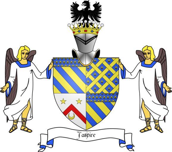 Keywords: Blason famille Vismes-Comtes (avec ornements).svg fr Blason des comtes de Vismes écartelé aux 1 et 4 d'or à trois bandes d'azur au chef du second semé de fleurs-de-lis du champ au 2 d'azur fretté d'or semé dans les claires-voies de fleurs-de-lis du même au 3 d'argent au chevron de gueules accolé en chef de deux étoiles d'or et en pointe d'un croissant du même l'écu tenu par deux anges au naturel à la couronne de comte et à l'aigle de sable en cimier own Syryatsu 2009-03-21 SVG coats of arms of families of France De Vismes family Quarterly shields Or three bends azure Chiefs in heraldry Semé-de-lis Fretty of eight Argent a chevron gules 2 five rays Or in heraldry 1 crescent Or in heraldry Argent azure gules Or in heraldry Angels in supporters Eagles in crest |
