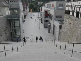| Keywords: Blick hinunter vom Säumarkt zum Kocherufer in Schwäbisch Hall.jpg Kocherufer in Schwäbisch Hall Die Mauern die die Treppe flankieren sind alte Grabenmauern Unten rechts beginnt das mit der neuen Treppe erbaute Stadtviertel Kocherquartier Die älteren Häuser links liegen in der Front der alten nördlichen Stadtmauer der Kernstadt in der Talaue die im Zuge ihrer Ausbaustufe zwischen 1200 und 1250 gegen den Froschgraben errichtet wurde Etwas links der Mitte erkennt man hinten ihren nordwestlichen Eckturm Diebsturm an ihrem Knick nach Süden <br /> Angaben nach <br /> Eduard Krüger Die Stadtbefestigung von Schwäbisch Hall Verlag Hans P Eppinger Schwäbisch Hall 1966 own 2011-05-04 Brtlwr2 <span class signature-talk >talk</span> 49 06 50 65 N 09 44 09 81 E region DE_heading W Cc-zero Stairs in Schwäbisch Hall Vom Säumarkt hinunter ins Kocherquartier in Schwäbisch Hall Towers in Schwäbisch Hall Diebsturm in Schwäbisch Hall |