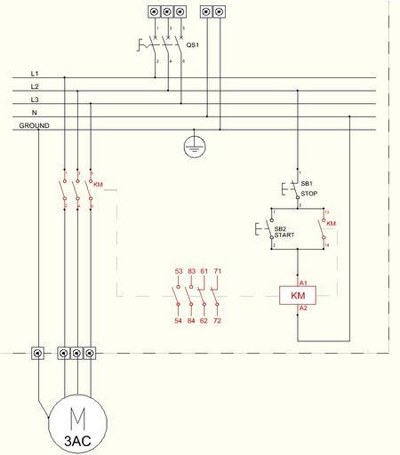 Keywords: Blocking switch for driving load.jpg en I had lot of questions from beginners how to switch on the load using only Normal-Open NO button -So it is very simple You're pushing the button SB2 current starts to gain through contactor KM There appears circuit hot wire - terminal - SB1 - SB2 and paralel doubled on NO pair 13-14 at relay - contactor KM - zero wire To switch off you should push SB1 button own Dmitry G 2010-06-23 thumb left Lesson 1 - blocking contact driving 1-pole device thumb Lesson 2 - let's complicate 1-st lesson by 3 phases Motor launching circuits Self-blocking button |