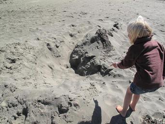 Keywords: blond blonde child girl sand beach pointing shadow brown grey play female person shore