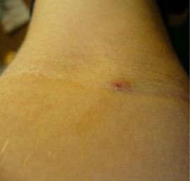 Keywords: Blood donation 494.jpg This is an image taken by me of my arm approximately 24 hours after donating blood It shows the slight bruising made by the needle own 10 03 2007 Nick Kneer Arms in blood donation