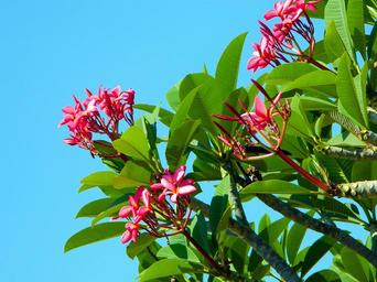 Keywords: bloom pink tree bush inflorescence foliage leaf sky blue thailand