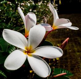 Keywords: blossom bloom flower white yellow frangipani plumeria white yellow frangipandi flor de cebo temple tree dog gift greenhouse apocynaceae ornamental plant national flower ornamental flower west indian frangipani plumeria alba flora beautiful petals inflorescence calyx lobes exotic