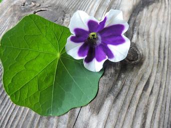 Keywords: blossom bloom leaf surfinie nasturtium old wood beautiful flower close