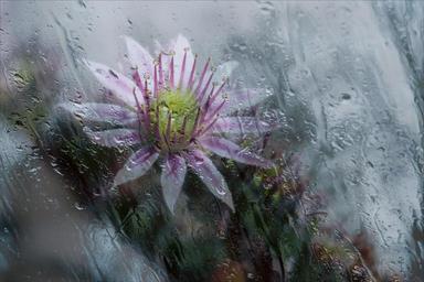 Keywords: blossom rainy drops water drops waterdrops wet flower hens and chicks wet glass close-up