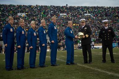 | Keywords: Blue Angels 131102-N-SH953-140.jpg en Cmdr Tom Frosch commanding officer and flight leader of the U S Navy flight demonstration squadron the Blue Angels accepts a University of Notre Dame football helmet from Capt Michael Ryan commanding officer of the University of Notre Dame's Navy Recruit Officer Training Candidate ROTC unit during the National Collegiate Athletic Association NCAA football game between the U S Naval Academy and University of Notre Dame at Notre Dame stadium The helmet was a gift from Notre Dame Football Head Coach Brian Kelly The Blue Angels performed a flyover of the University of Notre Dame Stadium prior to kickoff U S Navy photo by Mass Communication Specialist 2nd Class Kathryn E Macdonald/Released 2013-11-02 Petty Officer 2nd Class Kathryn Macdonald https //www dvidshub net/image/1046694 131102-N-SH953-140 2013-11-04 23 12 PENSACOLA FL US PD-USGov-Military-Navy Notre Dame Stadium Blue Angels Images from DoD uploaded by Fæ |
