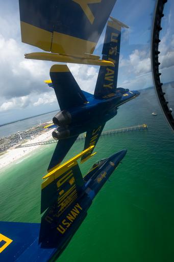 Keywords: blue angels jets fighters demonstration team air show cockpit view sky clouds ground intricate us navy outside