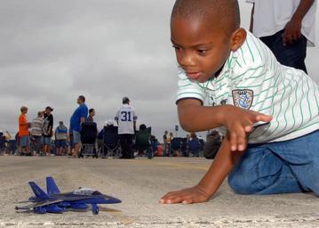 | Keywords: Blue Angels show in Jacksonville DVIDS125417.jpg en A young boy plays with his Blue Angel model plane at the 2008 Wings of Freedom Air Show aboard Naval Air Station Jacksonville The Blue Angels were amongst the many performers 2008-10-25 Petty Officer 1st Class Leah Stiles https //www dvidshub net/image/125417 081025-N-+++++-097 2008-10-31 00 36 JACKSONVILLE FL US PD-USGov-Military-Navy Blue Angels Images from DoD uploaded by Fæ | ||||