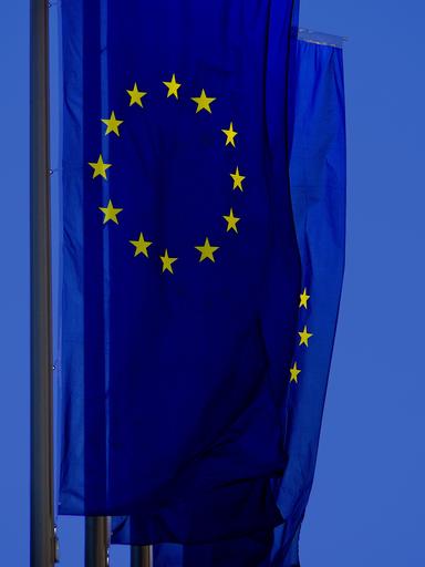 Keywords: blue emblem recognize europe europe flag flag flutter hoisted sky note national emblem mark country symbol landmark blow wind