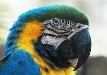 Keywords: blue macaw head face beak eye colorful exotic tropical wild parrot yellow red cute feather jungle bright profile portrait