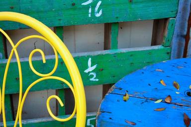 Keywords: blue yellow green pallet table chair half