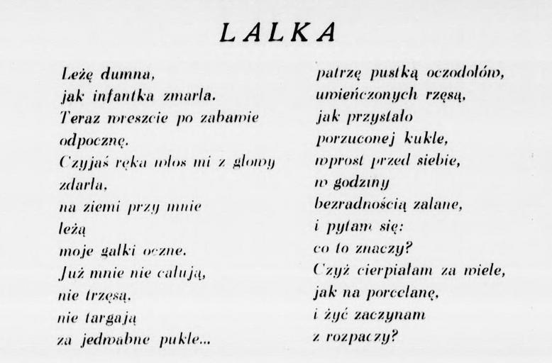 | Keywords: Bluszcz rok LXII nr 14, 6 kwietnia 1929 p05-01.jpg pl skan z czasopisma PL 1929 http //www wbc poznan pl/dlibra/publication id 90510 from dirids 1 tab 1 lp 1 QI 1A924FBA1EA9510E98FAB93D43665DA6-1 WBC Maria Pawlikowska-Jasnorzewska 1891-1945 other versions Custom license marker 2016 01 02 PD-old-auto-1996 1945 Poems by Maria Pawlikowska-Jasnorzewska published in 'Bluszcz' magazine Uploaded with UploadWizard | ||||