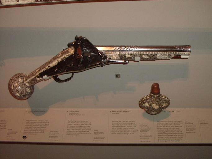 Keywords: BLW Pistol & Powder Flask.jpg Pistol<br /> 1579<br /> Southern Germany <br /> Steel chiselled and engraved with walnut stock engraved and inlaid with staghorn <br /> Barrel signed and dated \ SR 1579\ ; antler mount signed \ HB 1579\ <br /> <br /> The finest pistols for both hunting and battle were matched with powder flasks and cartridge boxes Their elaborate mounts and delicate inlays were made by specialists On this pistol-stock the closely set floral scrolls of antler enclosing grotesque masks birds and monkeys are signed by a separate hand from the chiselled steel barrel Hunting with early pistols which were not very accurate tested a horseman\'s ability to pursue game at close quarters <br /> This wheel-lock pistol has a mechanism that enabled it to be carried loaded The jaws of the lock clamped a piece of flint or a piece or pyrites designed to rub against the rough edge of the wheel projecting into the pan The wheel was revolved at speed by a tightly coiled spring wound by a separate spanner and released when the gun's trigger was pulled causing sparks to ignite the gunpowder in the breech <br /> Museum no 612-1893<br /> Collection URL http //collections vam ac uk/item/O69199/wheel-lock-pistol/<br /> <br /> Powder Flask<br /> Probably 1579<br /> Southern Germany<br /> Walnut inlaid with antler<br /> Museum no 67-1903<br /> Collection URL <br /> http //collections vam ac uk/item/O97393/powder-flask/ Adam Morgan Victoria and Albert Museum http //www vam ac uk/ 612-1893 http //collections vam ac uk/item/O69199/wheel-lock-pistol/ PD Wheellock pistols Gunpowder flasks Engraved weapons |