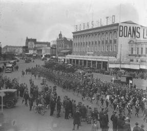 | Keywords: Boans1.jpg en Boans department store Perth Western Australia c 1928 Includes brass band playing in street with crowd gathered to listen and The Grand Central Shaftesbury Hotel in background http //innopac liswa wa gov au/search~S1 /dWellington+Street+ 28Perth 2C+W A 29+--+Photographs /dwellington+street+perth+w+a+photographs/-3 2C-1 2C0 2CB/frameset FF dwellington+street+perth+w+a+photographs 23 2C 2C58 State Library of Western Australia See also http //www slv vic gov au/pictoria/b/1/3/doc/b13275 shtml - Similar image possibly from a different year taken by Harvey John Henry 1855-1938 photographer PD-Australia Original upload log en wikipedia FtCG page en wikipedia Boans1 jpg wikitable - 10 17 10 June 2009 435 × 389 63 647 bytes Gobeirne w en <nowiki> cleaner version </nowiki> - 14 22 5 May 2007 598 × 478 28 622 bytes Moondyne w en <nowiki> Cropped </nowiki> - 07 30 5 May 2007 704 × 528 36 615 bytes Moondyne w en <nowiki> Boans department store Perth Western Australia c 1938 Source http //www slv vic gov au/pictoria/b/1/3/doc/b13275 shtml PD-Australia </nowiki> Perth Western Australia |