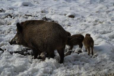 Keywords: boar wild boar pig forest deer park bache wildlife park animal mother bristles foraging habitat winter wintry snowy