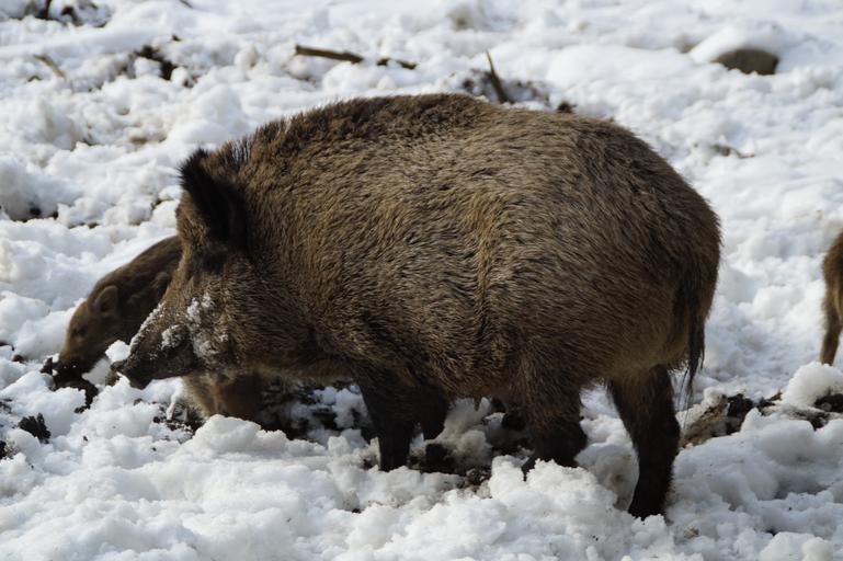 Keywords: boar wild boar pig forest deer park bache wildlife park animal mother bristles foraging habitat winter wintry snowy
