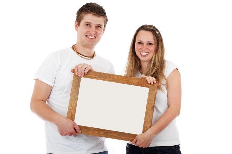 Keywords: board blank border couple empty female frame girl holding male man people picture isolated together two white woman young