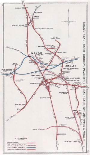 Keywords: Boar's Head, Haigh, Hindley, Pemberton, Plank Lane, Strangeways & Wigan RJD 77.jpg Railway Junctions in Boar's Head Haigh Hindley Pemberton Plank Lane Strangeways Wigan pre grouping Railway Junction Diagram and 1907 1914 Railway Clearing House Author died more than 70 years ago - public domain PD-old DEFAULTSORT 077 Railways Junctions Diagram 1914 041-080 Greater Manchester RJD Lancashire RJD 1914 Great Central Railway RJD Lancashire and Yorkshire Railway RJD London and North Western Railway RJD |