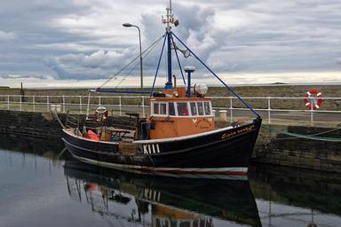 Keywords: boat fishing boat fishing sea reflection water harbor harbour pier marine port dock nautical transport industrial marina jetty outdoors mooring wharf scene coast wooden orkney kettletoft sanday scotland north isle island peaceful