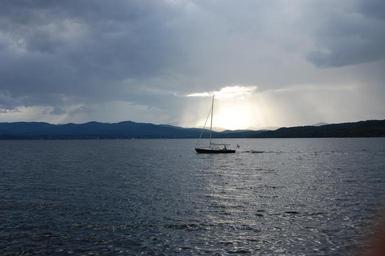 Keywords: boat lake sailing boat calm quiet alone sunset cloudy