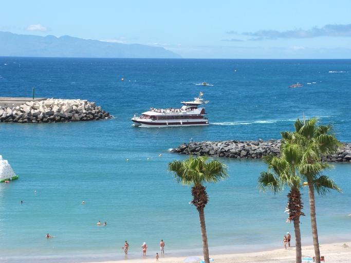 Keywords: boat ship beach sea ocean palms palm trees rocks sky hot holidays sand warm