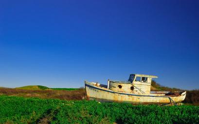 Keywords: boat vintage oldschool rust grass fields blue sky