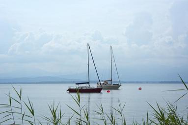 Keywords: boats anchorage water lake landscape chiemsee sky clouds reed romantic