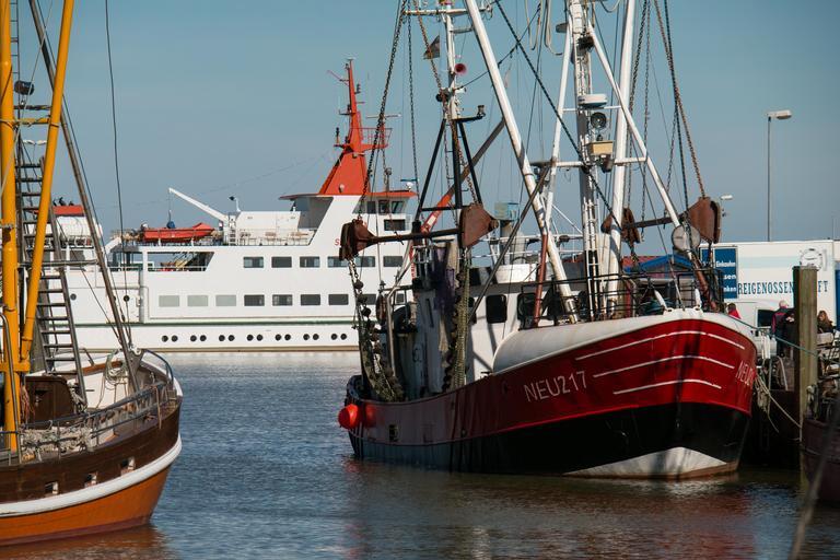 Keywords: boats port ships ferry fishing boats mast mirroring sea north sea docks neuharlingersiel water sky lake blue holiday