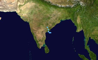 | Keywords: BOB-03 1998 track.png Track map of Deep Depression BOB 03 of the 1998 North Indian Ocean cyclone season The points show the location of the storm at 6-hour intervals The colour represents the storm's maximum sustained wind speeds as classified in the Saffir-Simpson Hurricane Scale see below and the shape of the data points represent the nature of the storm according to the legend below User Nilfanion/Tc/T Created by Cyclonebiskit using Wikipedia WikiProject Tropical cyclones/Tracks The background image is from NASA Tracking data switch source from the National Hurricane Center <sup>http //www nhc noaa gov/pastall shtml</sup> from the Central Pacific Hurricane Center <sup>http //www prh noaa gov/cphc/summaries/</sup> from the Joint Typhoon Warning Center <sup>https //metocph nmci navy mil/jtwc/best_tracks/</sup> from the Japan Meteorological Agency <sup>http //www jma go jp/jma/jma-eng/jma-center/rsmc-hp-pub-eg/besttrack html</sup> from the National Hurricane Center <sup>http //www nhc noaa gov/pastall shtml and the Central Pacific Hurricane Center http //www prh noaa gov/cphc/summaries/</sup> from the Central Pacific Hurricane Center <sup>http //www prh noaa gov/cphc/summaries/ and the Joint Typhoon Warning Center https //metocph nmci navy mil/jtwc/best_tracks/</sup> from the w National Hurricane Center <sup>http //www nhc noaa gov/pastall shtml</sup> or the Joint Typhoon Warning Center <sup>https //metocph nmci navy mil/jtwc/best_tracks/</sup> 2009-07-16 Cyclonebiskit 1998 North Indian Ocean cyclone season track maps |