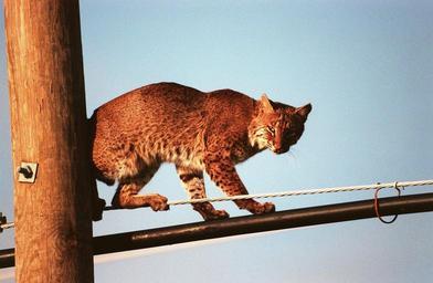 Keywords: bobcat feline power-line wire sky clouds nature outside close-up