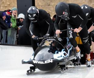 Keywords: bobsled competition team pushing snow sport athletes speed bobsledding sled winter